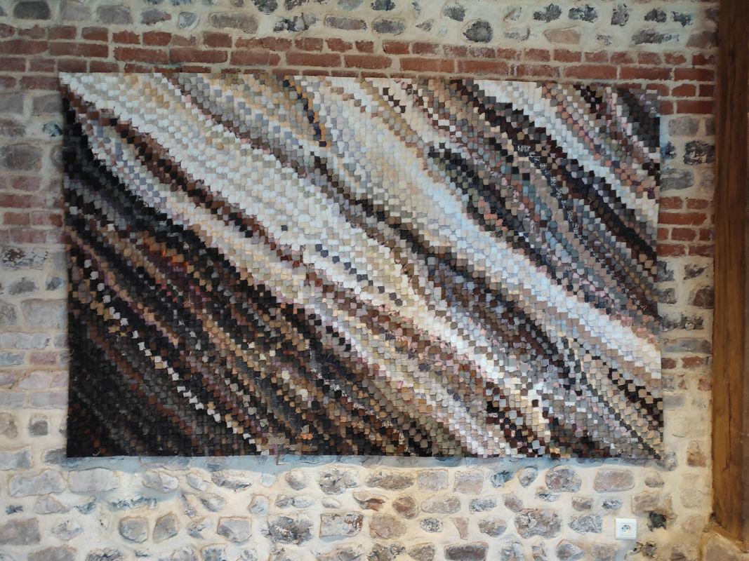 Beschreibung: Das Werk Die Haut der Welt ist eine emanzipierte Fortsetzung der Arbeiten der Serien Augenblicke und Fließendes Wasser mit weicheren Diagonalen. Die Dreidimensionalität wird zur Selbstverständlichkeit und verleiht dem Ganzen mit den ausgewählten Farbtönen eine wahre Sinnlichkeit.